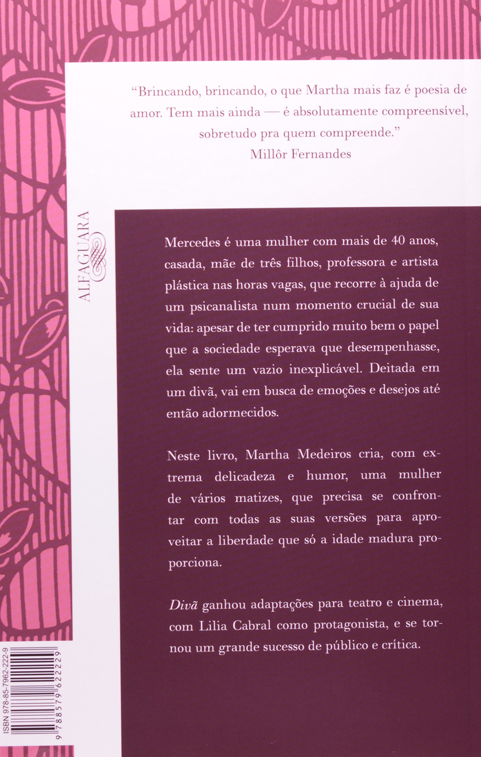 Mercedes é uma mulher com mais de 40 anos, casada, mãe de três filhos, professora e artista plástica nas horas vagas, que recorre à ajuda de um psicanalista num momento crucial de sua vida - apesar de ter cumprido muito bem o papel que a sociedade esperava que desempenhasse, ela sente um vazio inexplicável. Deitada em um divã, vai em busca de emoções e desejos até então adormecidos. Relembra passagens importantes de sua história, como a perda precoce da mãe, as paixões que não deram certo, a opção pela carreira e o nascimento dos filhos. Com boas doses de autocrítica e uma enorme vontade de viver, Mercedes questiona as escolhas que fez e tenta planejar um futuro livre das convenções que sempre a sufocaram. No entanto, seu grande desafio é aprender a lidar com a liberdade. Em 'Divã', Martha Medeiros cria, com extrema delicadeza e humor, uma mulher de vários matizes, que precisa se confrontar com todas as suas versões para aproveitar a liberdade que só a maturidade proporciona.